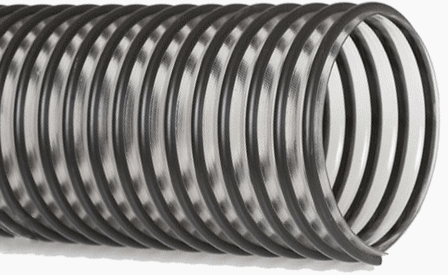 | Spiralite 940 PVC- POLYURETHANE BLEND DUCT AND BLOWER HOSE HOSEAPPEARANCE/CONSTRUCTION: Clear PVC/Polyurethane wall with black helix. Corrugated wall, and smoother interior. BENEFITS: -Unique blend of material provide excellent abrasion resistance. GENERAL APPLICATIONS: -Material conveying -Transferring abrasive application -Bark blowing applications TEMPERATURE RANGE: -10°F to +130°F STANDARD LENGTHS: 4" thru 5" in 100 ft |