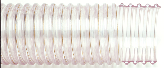 | Spiralite W145 ALL-CLEAR PVC CORRUGATED FOOD GRADE SUCTION HOSE WITH STATIC WIRE HOSE APPEARANCE / CONSTRUCTION: Clear PVC tube and helix. Corrugated wall,smooth interior. Static-conductive wire. BENEFITS: -Lightweight and highly flexible. -Non-toxic PVC conforms to FDA standards. -All clear construction allows easy material inspection. GENERAL APPLICATIONS: -Pneumatic conveying powder, pellets and granular materials. TEMPERATURE RANGE: -10°F TO +130°F STANDARD LENGTHS: 1-1/4" thru 6" in 100ft |