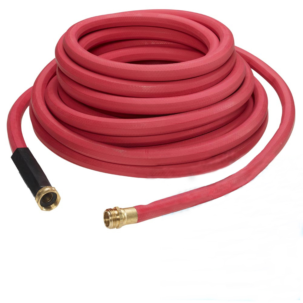| 150 PSIG 180°F CONTINUOUS Our Standard Hose Assembly (50FTRED) offers an economical light duty hose assembly ideally suited for hotels, hospitals, or restaurant kitchens. It is 50 feet of red 5/8" ID heavy duty red EPDM general purpose water hose with brass fittings. It is constructed with a braided textile reinforcement. Not suited for oily or fatty environments. (Not a Flex-Master 250 hose) |