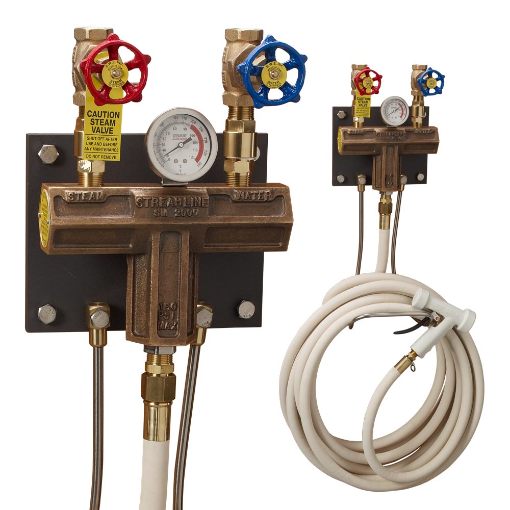 STEAMASTER 2000 Steam and Cold Water Mixing Station, Bronze Construction, includes Wall Mount, Bronze Globe Style Control Valves, In Line Check Valves, Stainless Steel Temperature Gauge, Stainless Steel Hose Rack and Mounting Plate with Stainless Steel Hardware (LESS HOSE AND NOZZLE)