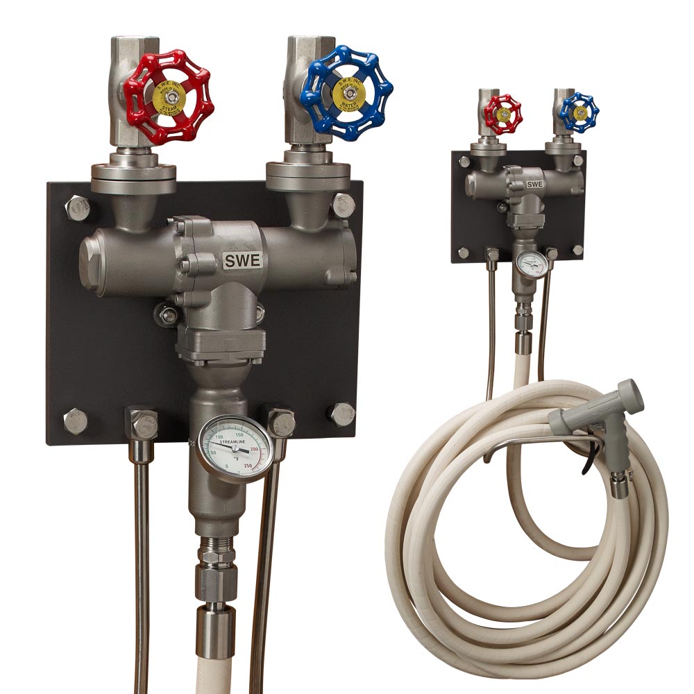 MIX MASTER 3000SS Hot and Cold Water Mixing Station, Stainless Steel Construction, Wall Mounted, with Stainless Globe-Style Control Valves, In-Line Check Valves, Stainless Steel Hose Rack, Sani-Mount Wall Bracket, Stainless Steel Hardware (LESS HOSE, NOZZLE and TEMPERATURE GAUGE)